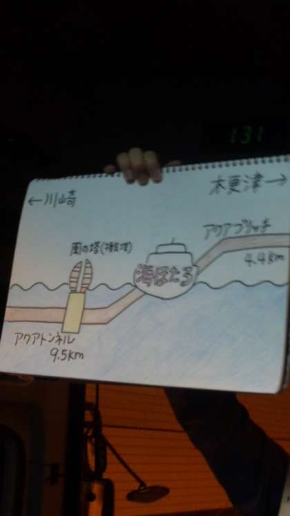 バスが出発し,東京湾アクアトンネルへ。川崎市と木更津市を結ぶトンネルです。途中アクアトンネルとアクアブリッジの接続部にある人工島海ほたるPAに寄りトイレ休憩。