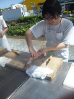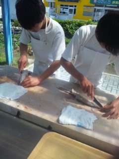 魚の干物作りをしています。魚を愛おしそうにさばいています。