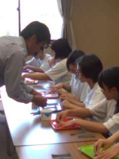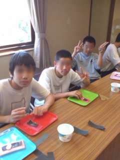 「クラムのお守りペンダント作り」のグループです。それぞれの願いを貝に書いてそれを一生懸命磨いています。
