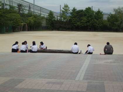 そこで,3年生は午前中の授業を終えたあと,今日は特別に,昼食は教室から飛び出しても良いことにして,好きな場所で食べることにしました。空はあいにく鉛色が支配していましたが,暑くもなくむしろ涼しいくらいで,おしりの汚れを少しだけ気にしながらも,気持ちの良いピクニック気分を味わうことができました。
