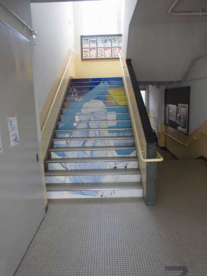 夏休み中に美術創作部が作ってくれました。本館の階段に飾られています。上段の「ひまわり」が1階階段、下段の「ピアノを弾く人」が2階階段に飾られています。