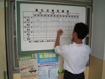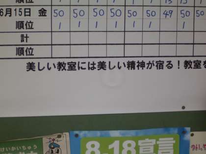 また,今週は美化点検週間でもありました。日を追うごとにどの教室もきれいになっていきました。最終日の今日は満点(50点)クラス続出で,取組の成果が上がってきた証拠ですね。