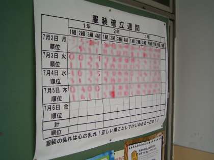 定期テスト2が終わった後,夏休みまでの生活をキチンとしようと,まず服装をキチンとすることに取り組んでいます。「服装の乱れは心の乱れ」を表していることはよくあることで,自ら服装を整えることを通して自らを律する心を養います。それは,こだわりを捨ててルールに従う素直さを身に付けることでもありますが,それはそれで大変でしょう。しかし,将来営むであろう社会生活を視野に入れた時には,その力を基盤としてはじめて個性的に生きることもできるのです。