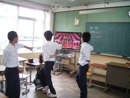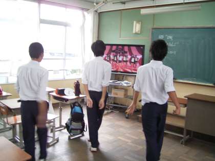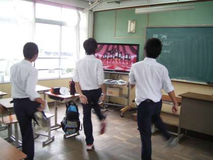 3年生の舞台発表の一つ・・・ダンスチーム。DVDを見ながら振り付けを模しています。