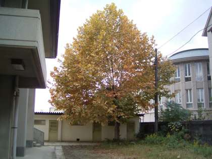 正門を入ってすぐの左手に色づいた花水木が見られます。一本はすでに葉が落ち,枝がむき出しになっているのもありますが,残りは今紅葉の見頃となっています。また,体育館の北西角にポプラの一種でしょうか,こちらも黄葉に色づき始めています。枝から幾筋もの実が垂れ下がっているのも,珍しい光景として見ることができます。