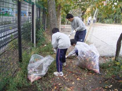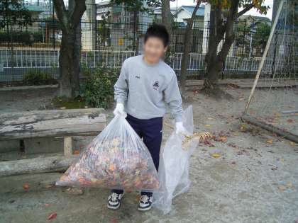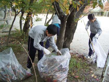 学校での仕事はグリーンベルトの柵直しや,落ち葉拾い。特に今の時期の落ち葉は,用務員さんがいくら毎日掃除をしても一向にきれいになる事はありません。全ての葉が落ちきってしまうまで,しばらくは落ち葉との格闘です。そんな大変な仕事をいつも一人でしていただいている用務員さんの少しでもお手伝いをすることは,働くことが人の役に立っているということを身近なところで理解できるというものです。