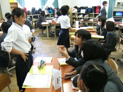 活動後に書いてもらった生徒の感想の中に「いろんな人に聞いてもらえておもしろかった。」「クラス全体で発表するより話しやすかった。」「今まで以上に仲がよくなり、交流が深まってよかった。」「笑顔で質問してくれ、答えての繰り返しが楽しかった。」といったものが多く見られました。学習活動自体が楽しい。こんな時間がもっと増えるといいですね。