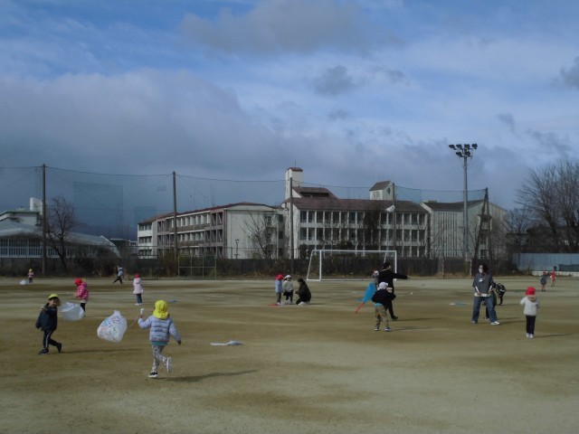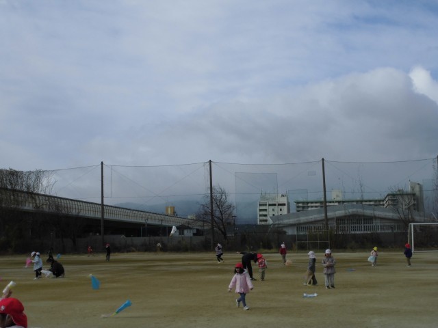 幼稚園の園庭の数倍あるグラウンドで、「大きい」「広い」と口々に喜んでいました。今日から、また寒くなってきましたが、そんな中、園児たちはグラウンド全部を走り回って、自分で作った「たこ」で、たこあげを楽しんでいました。