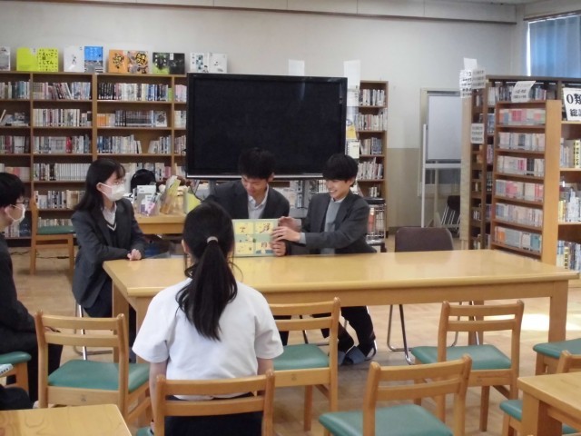 昼休みに図書館で「絵本の読み聞かせ」を実施しました。
