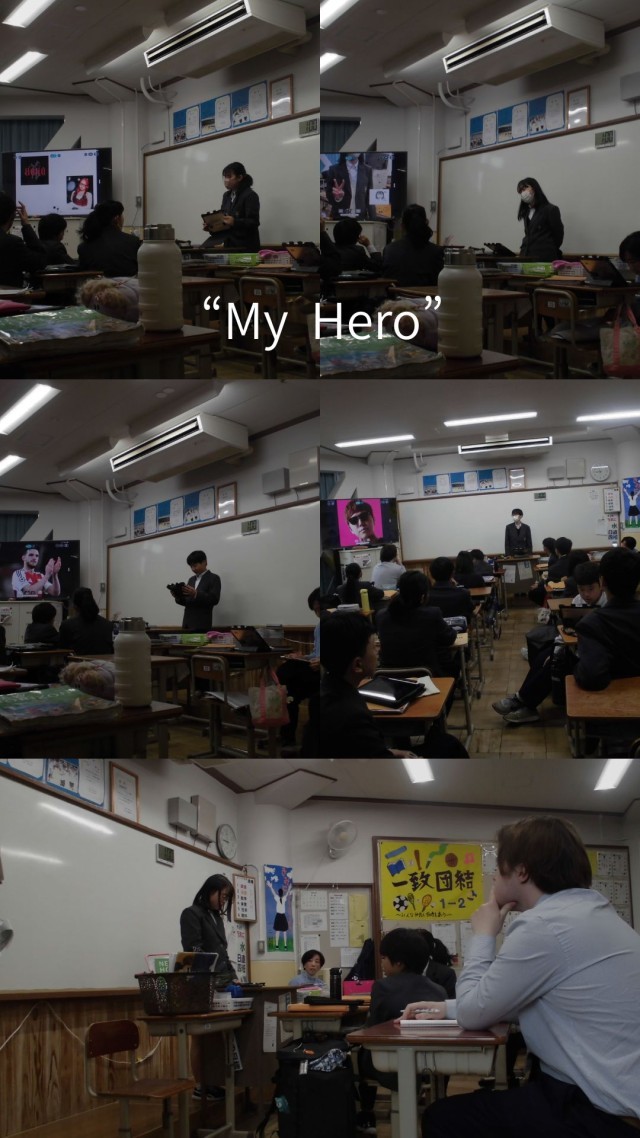 My hero is~. He[She] is~. など習った文を使って、名前や出身地、好きな理由を発表する生徒たちの表情はとても明るかったです。