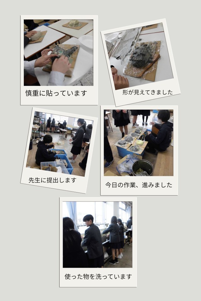 これまでの授業で作った粘土の土台に、ちぎった新聞紙や和紙をていねいに貼り、強度をつけていきました。