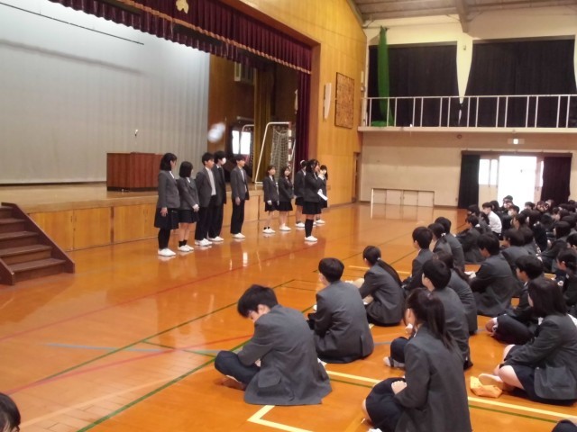 修了式の前に、伝達表彰として、書道、アナウンスコンクール、小さな巨匠展、女子バレーボール部の表彰と剣道部の紹介をしました。