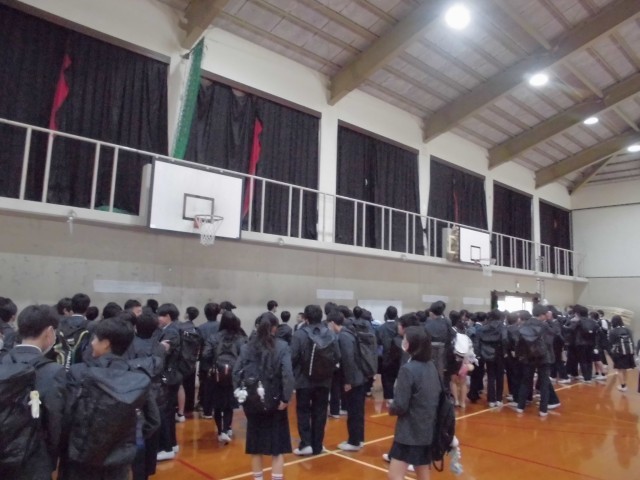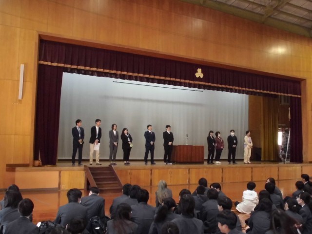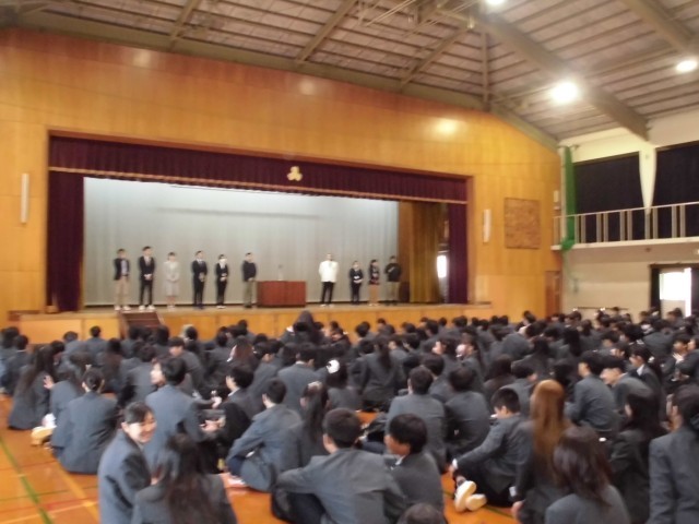 新2,3年生のクラス発表から始まり、新着任の教職員の紹介、そして、始業式で学年の先生の発表や部活動顧問の発表。