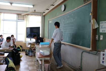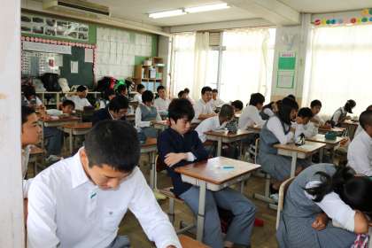 2年生のクラスが合唱コンクールに向けて、曲決めのための参考曲を聴いていました。