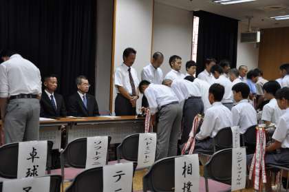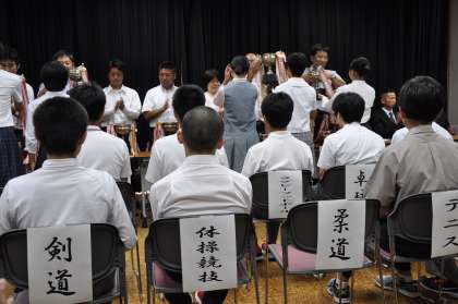 昨日、京都市の総合教育センターで昨年度の夏季大会の優勝杯返還式が執り行われました。卓球部女子と、剣道部男子が優勝杯を返還してきました。
