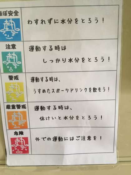 各部活動のキャプテンの皆さんは、こまめに休憩を取って、部員の体調を見つつ、少しでも、おかしいと思ったら、近くの担当の先生に申し出て下さい。
