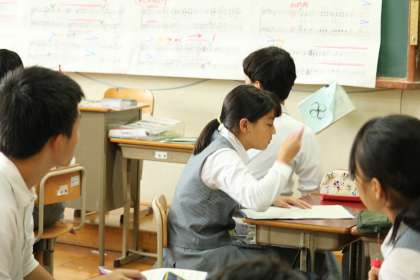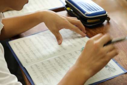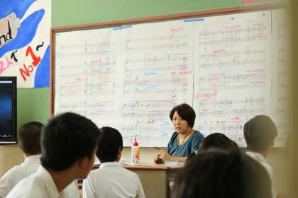 3年生の『走る川』クラスでは、大きな楽譜コピーが貼られ、記号を調べたり、楽曲分析が行われ、自分の楽譜にみんな必死で書き込んでいました。