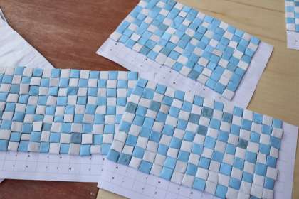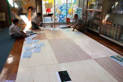 3年生の学年展示の、貼り付け作業が玄関ホールで行われていた。