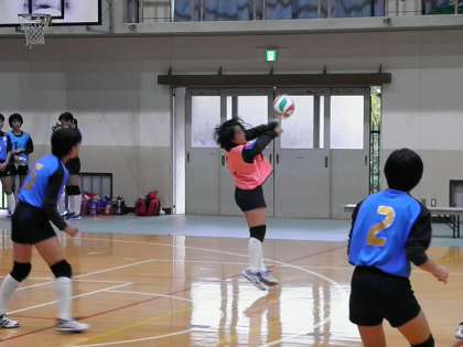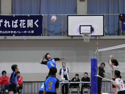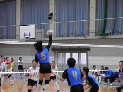女子バレー新人大会 公開日 2017/10/30 更新日 2017/10/30 学校の様子 新人大会決勝トーナメント1回戦 10月29日(日) VS修学院中 2−0 予選リーグを1位で通過し迎えた決勝トーナメント2回戦 第1セットは23−23の接戦となりましたが,そこから2ポイント連取し25−23, 第2セットも立ち上がり0−4と嫌な流れとなりましたが,その後は危なげなくポイントを重ね25−15で2−0の勝利となりました。