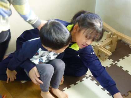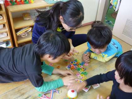 園児たちと一緒に楽しく遊んだり、 園児を順番に膝に乗せてお話ししています。