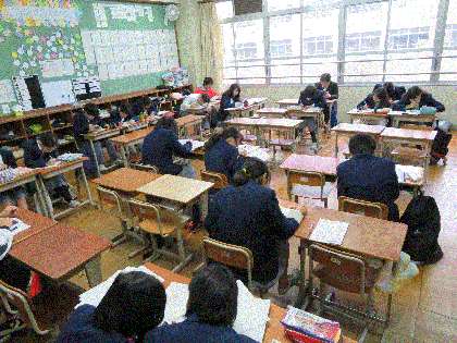 テスト前の土曜日に、2.3年生で土曜学習会が行われました 2年生は18名参加 雨の中、登校して頑張りました。
