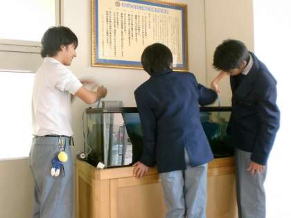 理科部・・・水槽掃除 公開日 2017/11/27 更新日 2017/11/27 学校の様子 テスト最終日、理科部で水槽掃除しました。 2か月ぶりですが、ピカピカになりました! 時々、じ〜〜〜〜っと覗いているのですが、 エビがいたり、熱帯魚がいたり、タニシが卵を産んでたり・・・ 生き物を見ていると、飽きません♪ 理科部の皆さん、ありがとうございます♪