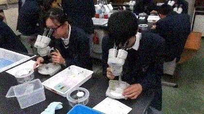 ・2年2組『かたつむり』の体のつくりを顕微鏡で観察している様子です。