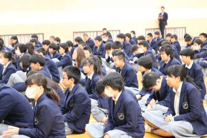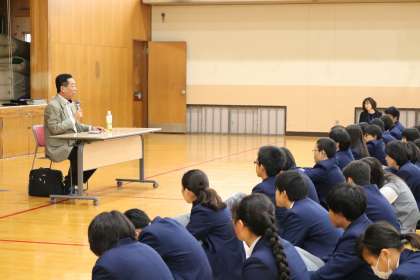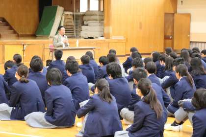 2年生・・・人権学習講演 公開日 2017/11/29 更新日 2017/11/29 2年生 今週から、各学年人権学習が始まります。 2年生では・・・ 水平社宣言でも知られる西光万吉ゆかりのお寺 奈良の西光寺のご住職さんにお越し頂き 人権のお話をして頂きました。