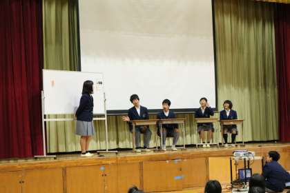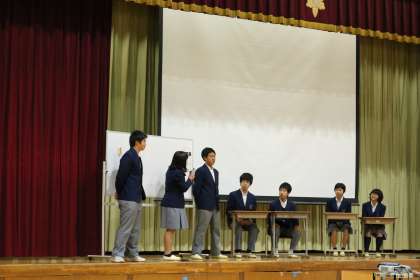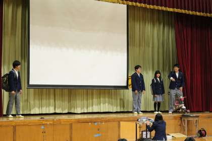 オープンスクール・・・オリエンテェーション編 公開日 2017/12/06 更新日 2017/12/06 学校の様子 生徒会の皆さんが、舞台に立ち、 学校生活のあれこれを 寸劇を挟んだりしながら 面白、おかしく、わかりやすく オリエンテェーションしてくれました。