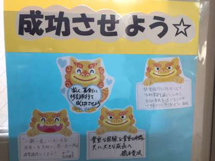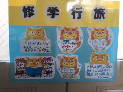 修学旅行に寄せる先生方の思い・・・ 公開日 2017/12/07 更新日 2017/12/07 2年生 修学旅行に寄せる先生方の思いもシーサーと共に貼ってありました。 良い旅行は、自分たちで作り上げて行くものです。 良い旅行になりますよ〜に・・・