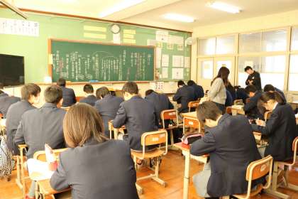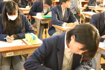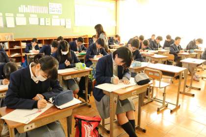ウインタースクール・・・3年(1) 公開日 2017/12/25 更新日 2017/12/25 3年生 今日から二日間3年生ではウインタースクールが行われています。 講座は2つ・・・ これは、小論文対策講座の様子です。 書き方などがレクチャーされた後、 お題に従って小論文を書いている模様です。 教室がほぼ満員状態。 みんな真剣に、黙々と書いていました。