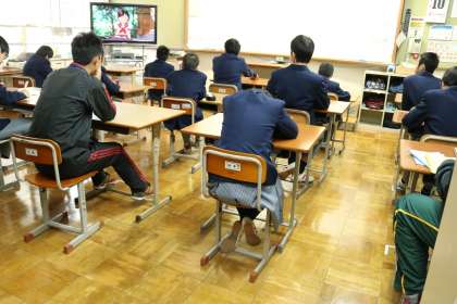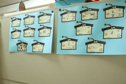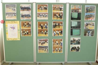 廊下には、年末の合同運動会の様子の写真が展示されています。