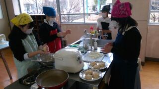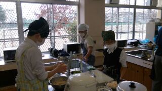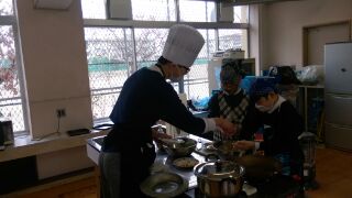 豆腐ハンバーグを、黙々と丸めます。 シェフまで登場!? シェフは。下級生の指導も行います。