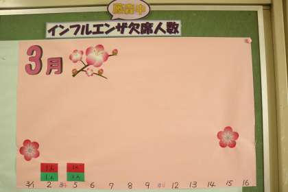 保健室の掲示物・・・3月 公開日 2018/03/06 更新日 2018/03/06 学校の様子 3月は、2月の掲示物のちょっと発展版 インフルエンザの罹患者数が3月版に・・・ 桃の節句ムード満載な感じです。 インフルエンザも、全校で2人。 1年間お伝えしてきた保健室掲示物も1巡しました・・・ 来年も楽しみですね♪