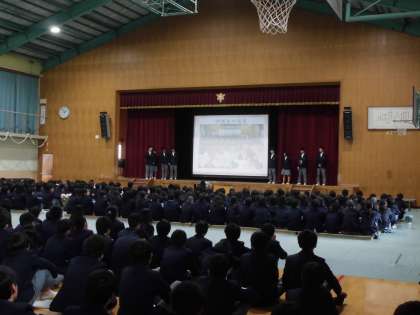 はじめに,全校生徒で「校歌」を歌い,新入生にお祝いのプレゼントの贈呈がありました。そして,生徒会本部や各種委員会の委員長の皆さんが中心となって,「藤中の1日」や「各行事」の紹介,そして評議・各種委員会の活動紹介をしてくれました。生徒会本部の皆さん,そして各種委員長の皆さん,皆さんのしっかりとした準備のおかげで,スムーズに整然と会が進みました。新入生にとって大変わかりやすく,中学校生活に向けての不安が大きく減ったことでしょう。見本となる上級生像を,しっかりと全校生徒に示してくれました。ありがとうございました。
