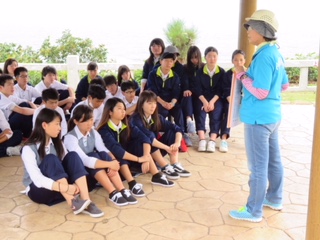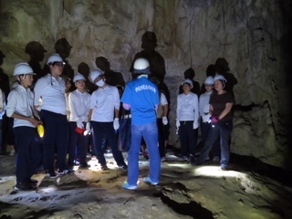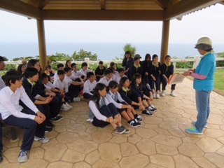 修学旅行1日目【ガマにて】 公開日 2018/04/24 更新日 2018/04/24 3年生 現地より 「ガマの中で黙祷を捧げたのち、[ぬちどぅ宝]命こそかけがえのない宝だということを真っ暗な中で感じました。 見晴らしの良い高台にて、当時の沖縄の様子の話を聞いています。」