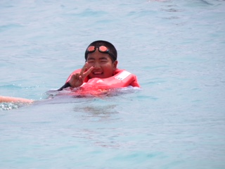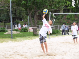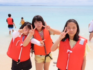 ライフジャケットを着用しての遊泳や、砂浜でのビーチバレー、グループ写真です。