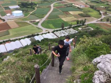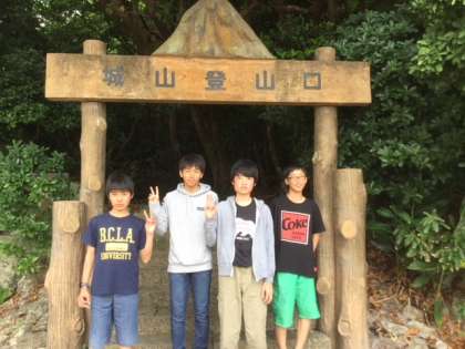 修学旅行2日目【民泊体験4】 公開日 2018/04/25 更新日 2018/04/25 3年生 現地より 「急な階段を登って城山登頂。 ヤッホーと言ったらヤッホーとかえってきました。天気は曇り空ですが、360度見晴らしが良く風も気持ちいいです。」 西脇