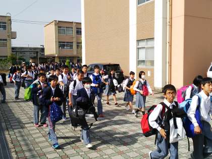 少し蒸し暑く感じる中ですが,学校での出発式の後,各クラスごとにバスに乗り出発しました。