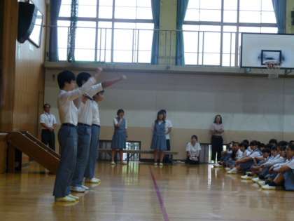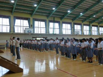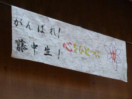 藤中800名の大応援団! 公開日 2018/07/05 更新日 2018/07/05 学校の様子 夏季大会激励会の直前、 生徒会の指揮で応援練習です。 全校生徒による寄せ書きでできた 横断幕も今日披露されました。 この後、校長室横の壁に掲示される予定です。