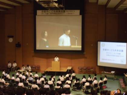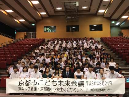 8月21日(火)、京都市総合教育センターで「第2回 京都市こども未来会議 京(みやこ)キッズ会議・京都市中学校生徒会サミット」が開催されました。本校からは、伏見支部の代表として生徒会本部から2名が参加しました。