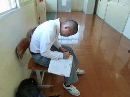 廊下で保護者を待つ間も、寸暇を惜しんで問題集を開く3年生。