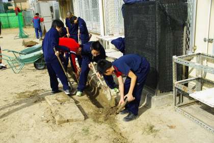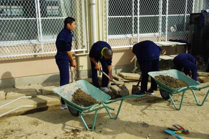 本日も,お世話になっている事業所が定休日の生徒は,朝から学校へ来て清掃活動に汗を流しています。グランドの周辺にある,側溝のコンクリートの蓋を開けて,中にたまった砂を除去する作業をしています。グランドに面した側溝なので,すごい量の砂が流れ込んでいました。