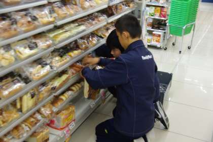 チャレンジ体験 公開日 2018/11/01 更新日 2018/11/01 2年生 コンビニエンスストアでのチャレンジ体験の様子です。パンの棚に商品を補充しているところです。店長さんから「こっちの棚も,2人に陳列してもらったんですよ」と教えてもらった棚を見ると,きれいに商品が並んでいました。