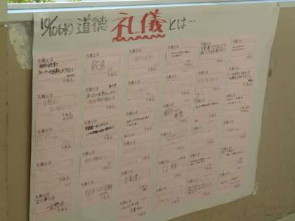 進路について(2年) 公開日 2018/11/07 更新日 2018/11/07 2年生 2年生は先週「生き方探究チャレンジ体験」を終え、今日は進路について学んでいます。 10年後、20年後にどんな仕事をしているのかを考えるのもとても大事なことですが、そのためにも、来年の今頃のことに思いを馳せるのも必要なことですね。 廊下にはちょうど一ヶ月前に学習した道徳「礼儀」の掲示物が貼ってありました。 いろいろなタイミングで学んでいることが、いま1つにつながろうとしています。