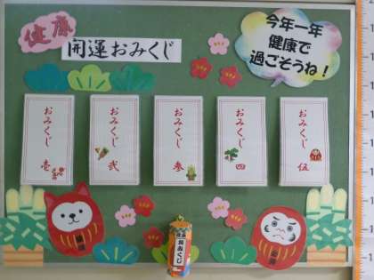 健康おみくじ?!(保健室より) 公開日 2019/01/09 更新日 2019/01/09 学校の様子 急激に寒さが増してきました。 入試を控えた3年生はもちろんですが、体調管理にはいつも以上に気を配りたいものですね。 いつも楽しい保健室前の掲示板、新年は何とおみくじです。 試しに引いてみると…「大吉」でした! 年のはじめの運試しにおすすめですよ。