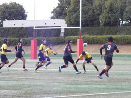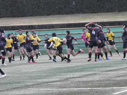 ラグビー新人大会 公開日 2019/02/18 更新日 2019/02/18 学校の様子 2月16日(土)宝ヶ池球技場 準決勝 VS西京極中 31−7 前半風上に立ちますが、攻撃がかみ合わず、14−0で折り返します。後半も攻め込まれる場面が多くなりますが、相手のミスと効果的な攻撃でトライを一つに抑え決勝進出を決めました。