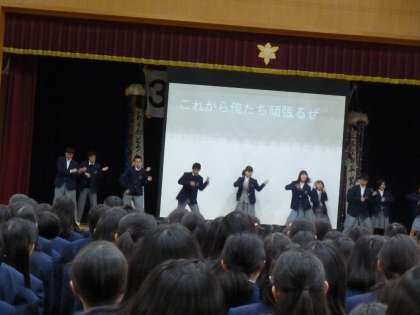 3年生を送る会(1) 公開日 2019/03/13 更新日 2019/03/13 学校の様子 1年生からのメッセージです。 各運動部のエールを大きな声で先輩に送りました。 写真はキレッキレの「今日から俺は」。
