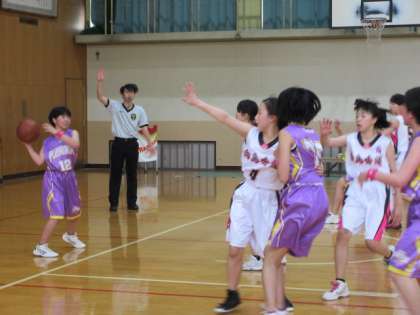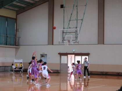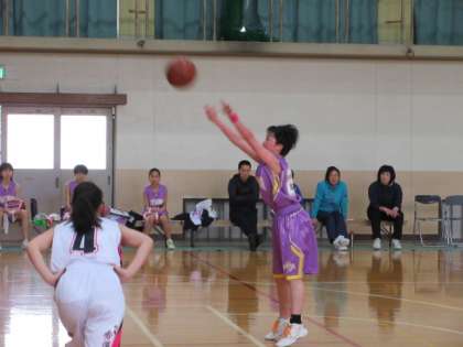 女子バスケットボール部の1試合目は、4月28日(日)に本校体育館にて行われました。相手は、今年度4月に開校した向島秀蓮小中学校です。終始攻め続け、58−39で見事勝利しました。