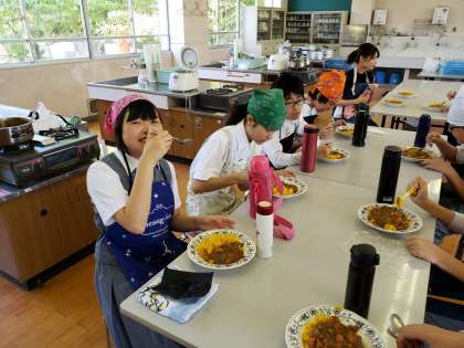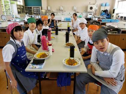 調理実習でカレーを作りました! 公開日 2019/05/30 更新日 2019/05/30 学校の様子 第1回目の調理実習(カレーライス)です。ターメリックライスと学校で収穫した玉ねぎを使って調理しました。おいしくできました!